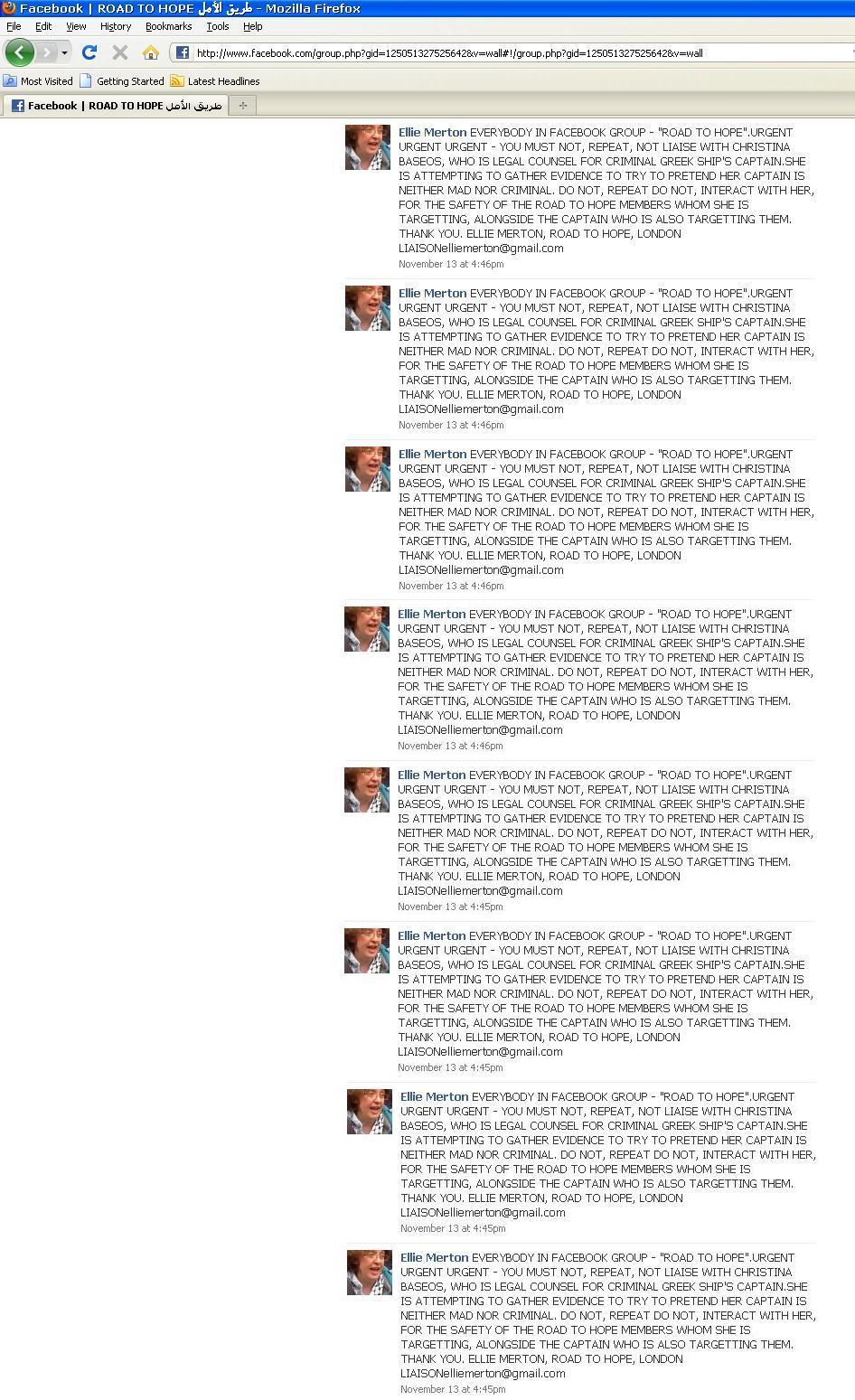 In regards to repeating comments over & over again and that being somehow an abuse of ‘freedom of speech’, I will only ask you to have a look at the screenshot concerning Ms. Ellie Merton (R2H’s official liaison at that time), where she posted 10 times in less than 2 minutes the same comment (simply by copy/pasting it), falsely claiming that I am a “legal counsel”, which is not true as I have no relation to the legal profession whatsoever and this can be verified by anyone on this planet, and asking people not to liaise with me as I am ‘dangerous’. I will not comment on the second part of her post and if I’m dangerous or not, as Ken O’ Keefe and the rest of the convoy members can tell you directly if any of them were directly or indirectly endangered by me. As far as it concerns the first part of Ms. Merton’s repetitive post, please tell me Mr. Davis, given that you are a man of facts and proof, since I am not a legal counsel, how would you call Ms. Merton’s claim? Does it fall within the defamatory/libel category according to your criteria?