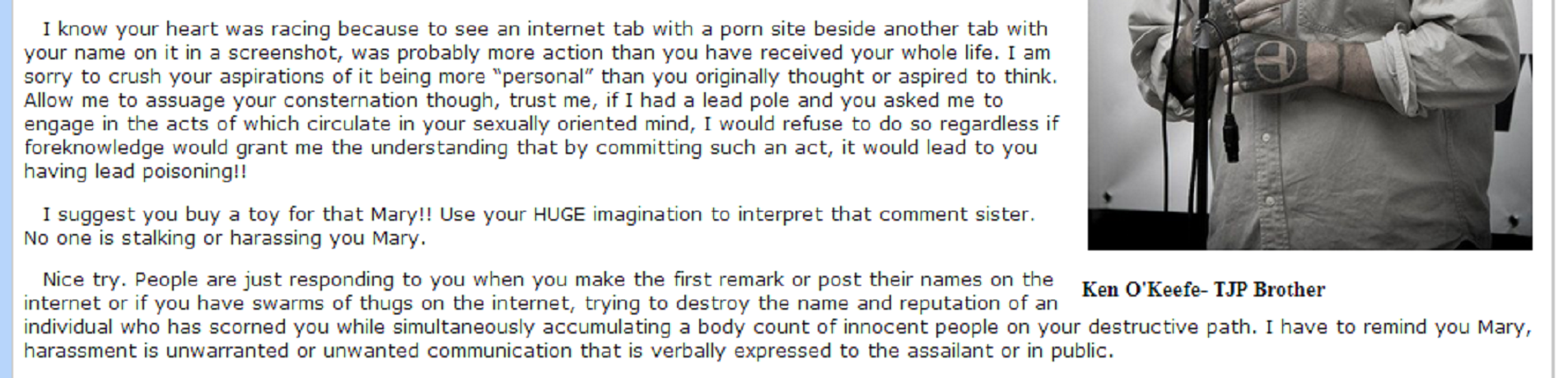 People should be what they say they are and they should not be hypocrites, right? Even though the players here are all extremely minor, as they are, if they are expecting others to trust them, they should be consistent. Siraj Davis is an obscure ESL teacher who seems to think he is at the cutting edge of activism, But, this isn’t about Siraj. This post is about his Sister Mary. (One of the Three Mary’s, which some may remember). Mary has a public persona where she engages in discussion with the hardcore Ken O’Keefe supporters underneath a screenshot by Siraj in a smear campaign against some woman who asked for the return of money she had lent or given to Siraj. Unfortunately, it was not possible to take a screenshot of the comments, as Siraj had to cancel the photos on his wall, due to the embarrassing nature of documenting his interest in porn clips of the “Sex with Mommy” genre, but I did copy the material in a document at the time. Mary Shepard promises enticing screenshots to give to Siraj. ENJOY the loving relationship!