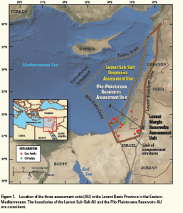 According the United States Geological Survey (USGS) and using its map as a visualization tool, the Levant Basin Province starts in a sharp point under the Egyptian Sinai Peninsula close to the Israeli border and runs up the Levant Transform Zone through Israel, Lebanon and Syria as it bumps against the Jordan Rift Valley on the east. It ends inland from the Turkish coast then juts out in a triangle reaching into the Mediterranean and into Cyprus’ territorial island waters. The last leg of the triangle shoots south in a wide curve under the Mediterranean until it rejoins the Sinai point. It’s divided into three sub-strata reserves.