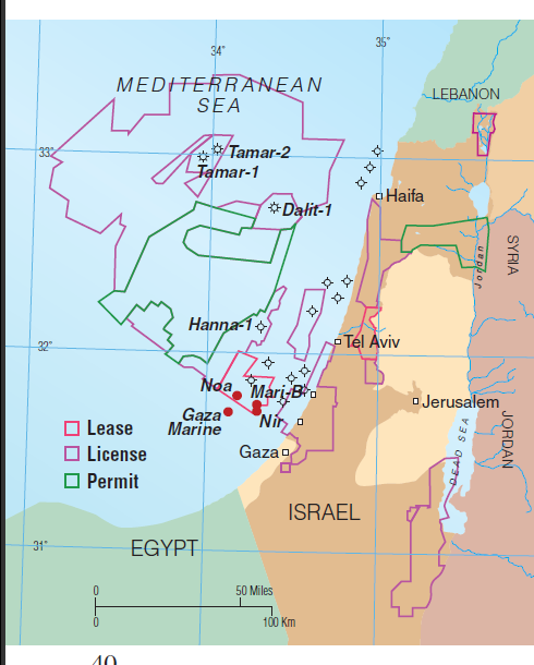 The Levant Margin Reservoirs western edge runs north/south a mile or so off the shores of Israel, Lebanon and Syria. Its land mass is pushed upward causing the ripples that form the hills of Jerusalem and the Lebanon Mountains until they bump into the Jordan Valley It contains mostly natural gas and some oil.